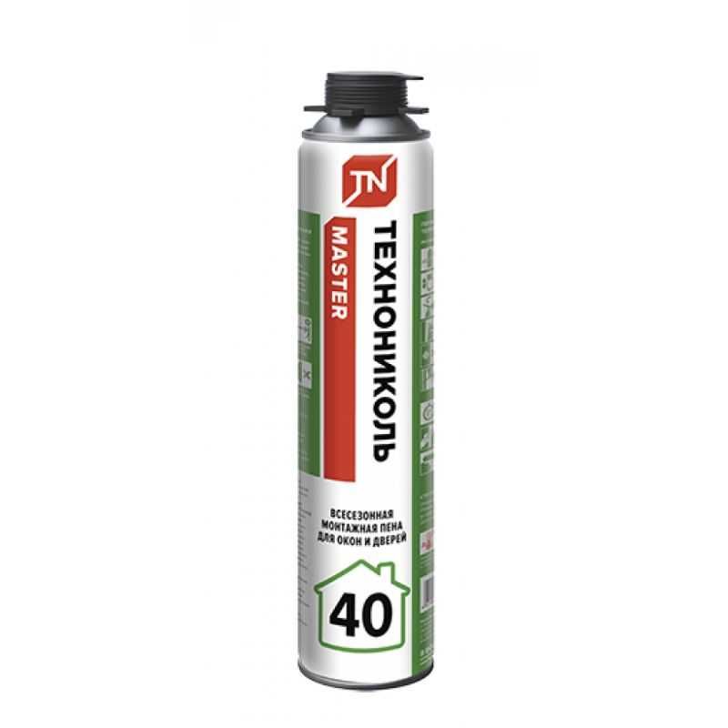 Монтажная пена ТЕХНОНИКОЛЬ 40 MASTER всесезонная — полиуретановая пена высокого качества на основе уникальной формулы, разработанной собственным научным центром. Всесезонная монтажная пена ТЕХНОНИКОЛЬ обеспечивает отличную звуко- и теплоизоляцию, а также обладает хорошей адгезией к большинству строительных материалов: бетону, дереву, металлу, камню и т. п.